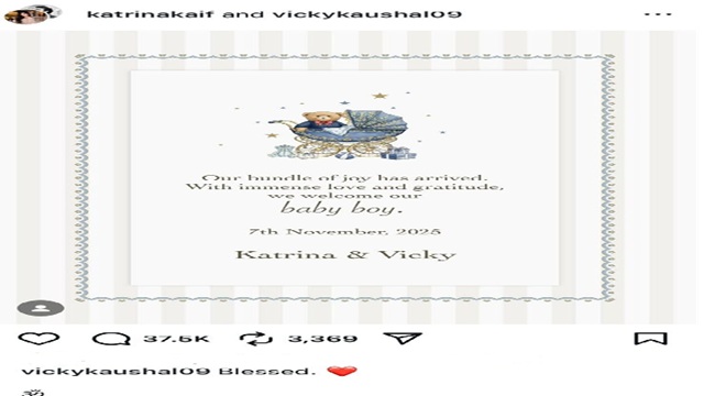 The actors shared a card with an image of a teddy on a blue cradle saying, “Our bundle of joy has arrived. With immense love and gratitude, we welcome our baby boy. 7th November, 2025 Katrina & Vicky”