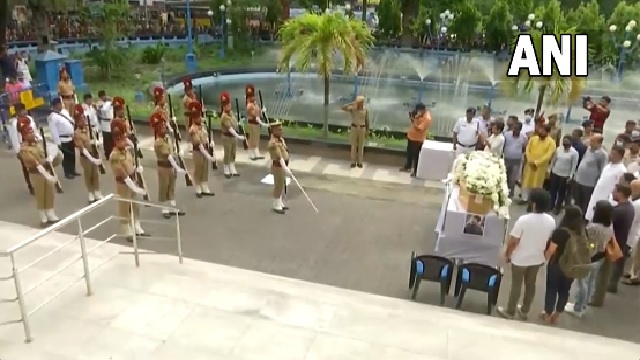 #WATCH | West Bengal: Gun salute accorded to singer #KK at Rabindra Sadan in Kolkata. CM Mamata Banerjee and members of the family of KK are also present here.