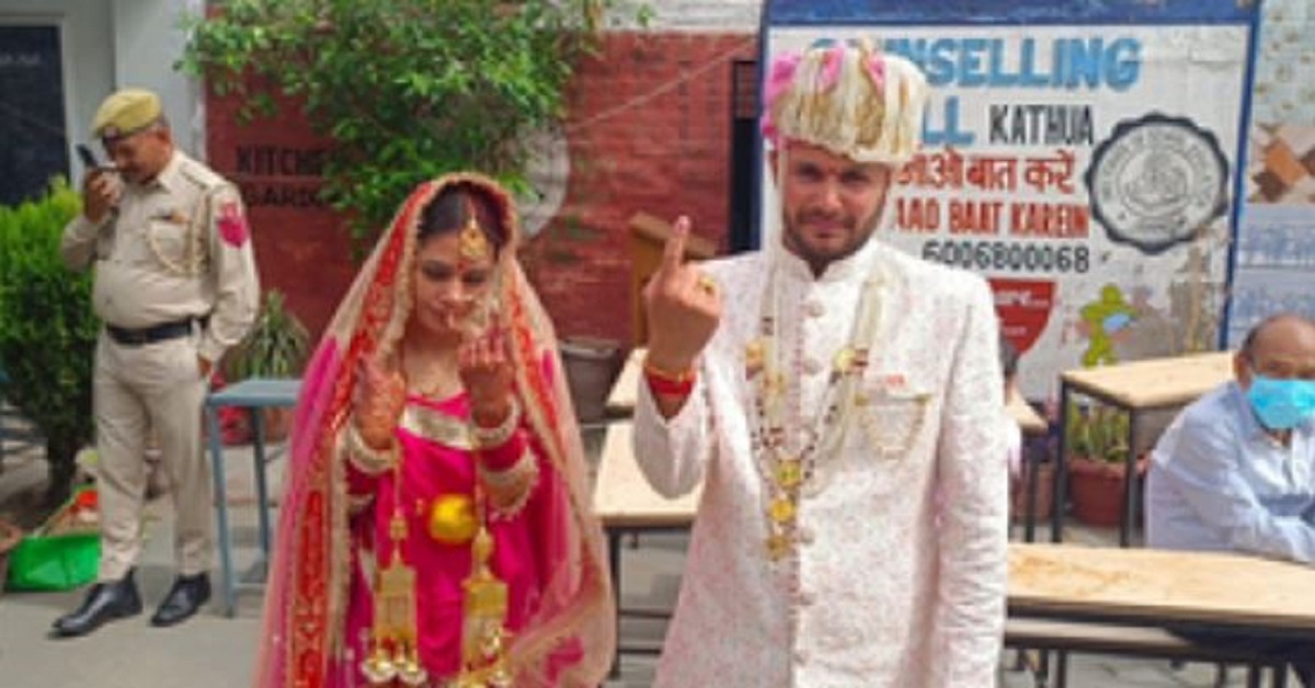 Kathua: Voters’ faith in democracy and their will to exercise franchise was witnessed on Friday during the poll process in Kathua where a couple cast their vote on the day of their marriage.