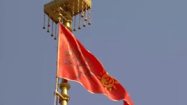 The ‘Dharma Dhwaj’ carries three sacred symbols, Om, the Sun and the Kovidara tree, each representing profound spiritual values rooted in the Sanatan tradition. The right-angled triangular flag, measuring 10 feet in height and 20 feet in length.