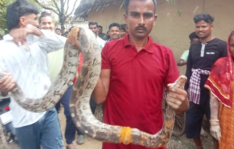 Soro: A 12 foot long python has been rescued in Balasore district of Odisha on Monday. The huge snake was rescured from the Nahanga village under Khaira Police Station limits in the district.