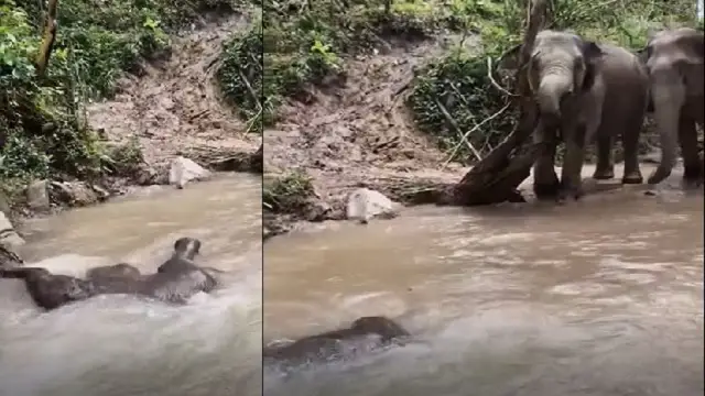 This morning, the elephant calf was seen enjoying a bath while its mother and other elephants stood guard nearby. Afterward, the herd, including the baby elephant, returned to the forest.