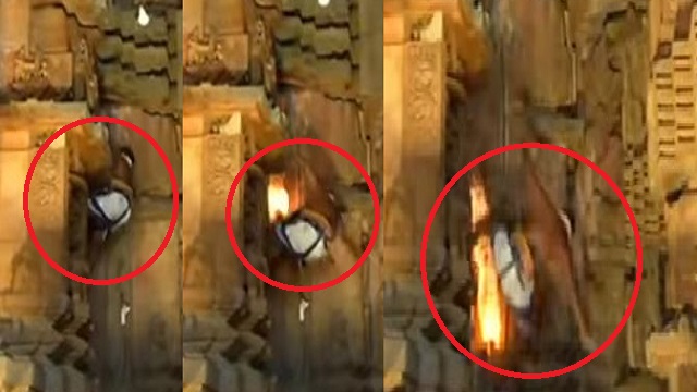 However, the servitor , who was carrying the Mahadeepa to the pinnacle of the temple, fell down after he climbed around 10-15 feet height of the temple wall.