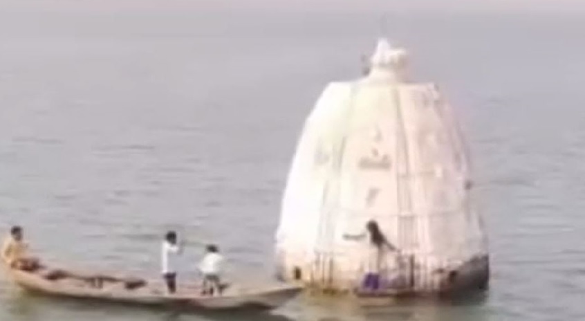 The temple, located within the Hirakud reservoir's backwater, was part of a village submerged when the Hirakud dam was constructed in 1958.