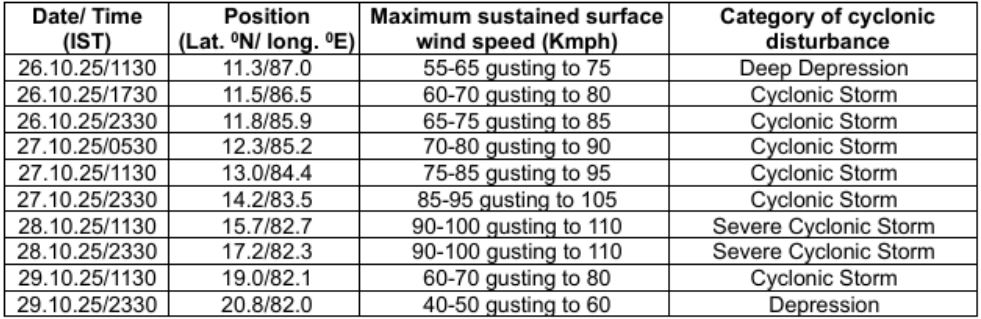 According to the IMD, the deep depression over southeast Bay of Bengal moved northwestwards with a speed of 5 kmph during past 6 hours, and lay centred at 1130 hrs IST of today, the 26th October 2025, over the same region, near latitude 11.3°N & longitude 87.0°E, about 620 km west of Port Blair (Andaman & Nicobar Islands), 770 km east-southeast of Chennai (Tamil Nadu), 820 km south-southeast of Visakhapatnam (Andhra Pradesh), 810 km southeast of Kakinada (Andhra Pradesh) and 920 km south-southeast of Gopalpur (Odisha).