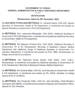 Also, Lopamundra Mohapatra, Additional Secretary to Government, PR and DW Department, was transferrd and posted as Additional Secretary to Government, Health and Family Welfare Department.