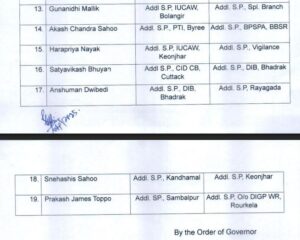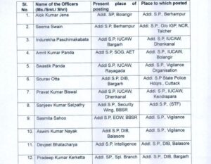Apart from that Aswini Kumar Nayak, Additional SP, DIB, Balasore was transferred as Additional SP, Vigilance. Besides, Snehashis Sahoo, the Additional SP of Kandhamal was transferred as Additional SP, Keonjhar.