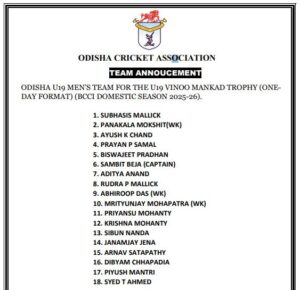 Cuttack: The Chairperson of the Odisha Junior Men’s Selection Committee Natraj Behera, along with Pravanjan Mullick, Head Coach, Odisha U-19 Men Team, officially announced the 18-member squad for the Vinoo Mankad Trophy (One-Day forma) (BCCI Domestic Season 2025-26) today at a press meet.