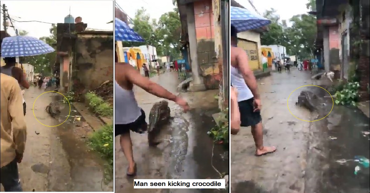 A huge crocodile was spotted roaming on the road in Uttar Pradesh recently. A video has gone viral on social media that shows the crocodile crawling on a lane while people are running for life. Even, a man was seen kicking the reptile in its tail.