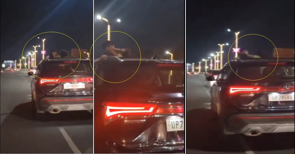 Lucknow car viral video shows a couple is engaged in public display of affection (PDA). The said recent video from Lucknow which has so far gone viral on social media shows a couple kissing and hugging each other while standing on the open roof of a running car.