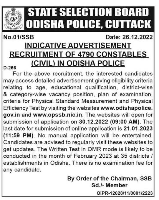 Great opportunity for the job seekers! The Odisha Police Recruitment Board has invited online applications for recruitment of 4790 Constables across the State.
