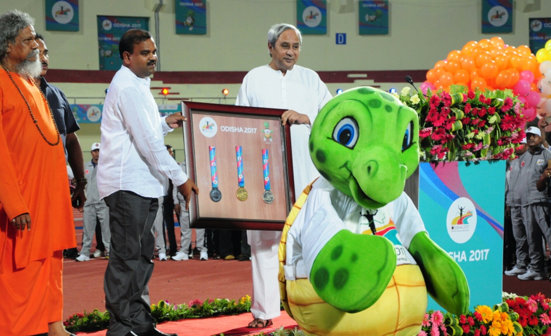 Mascot Olly (on foot) took the CM on a ride in a battery operated car around the stadium. CM Naveen Patnaik also felicitated Odia Athletes Dutee Chand, Srabani Nanda, Amiya Malik and Jauna Murmu and presented them cheques worth Rs 3 lakh each.