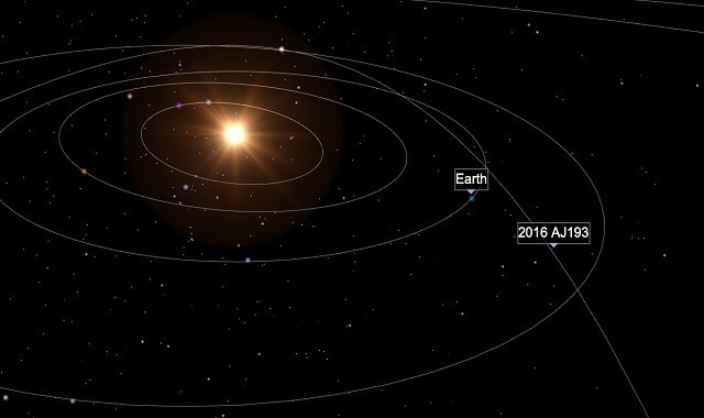 Asteroid 2016 AJ193 at its closest to Earth will sweep some 8.9 times the Moon’s distance from us.